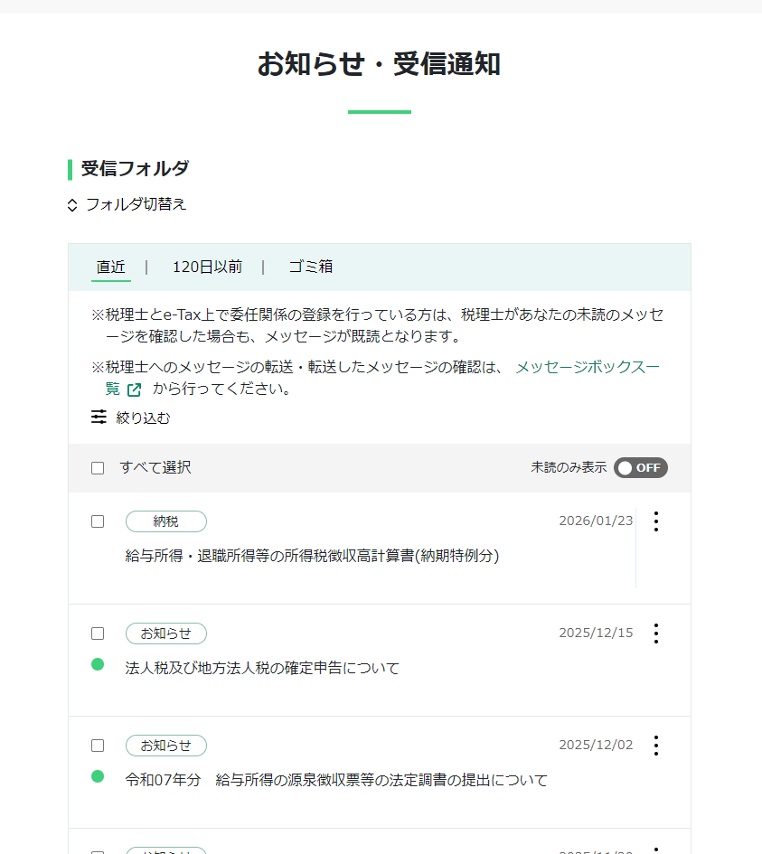※納税に関するメッセージが無い場合は、税理士さんがまだその件を作成していないので、税理士に納税できるように指示をする
